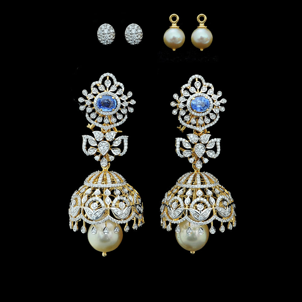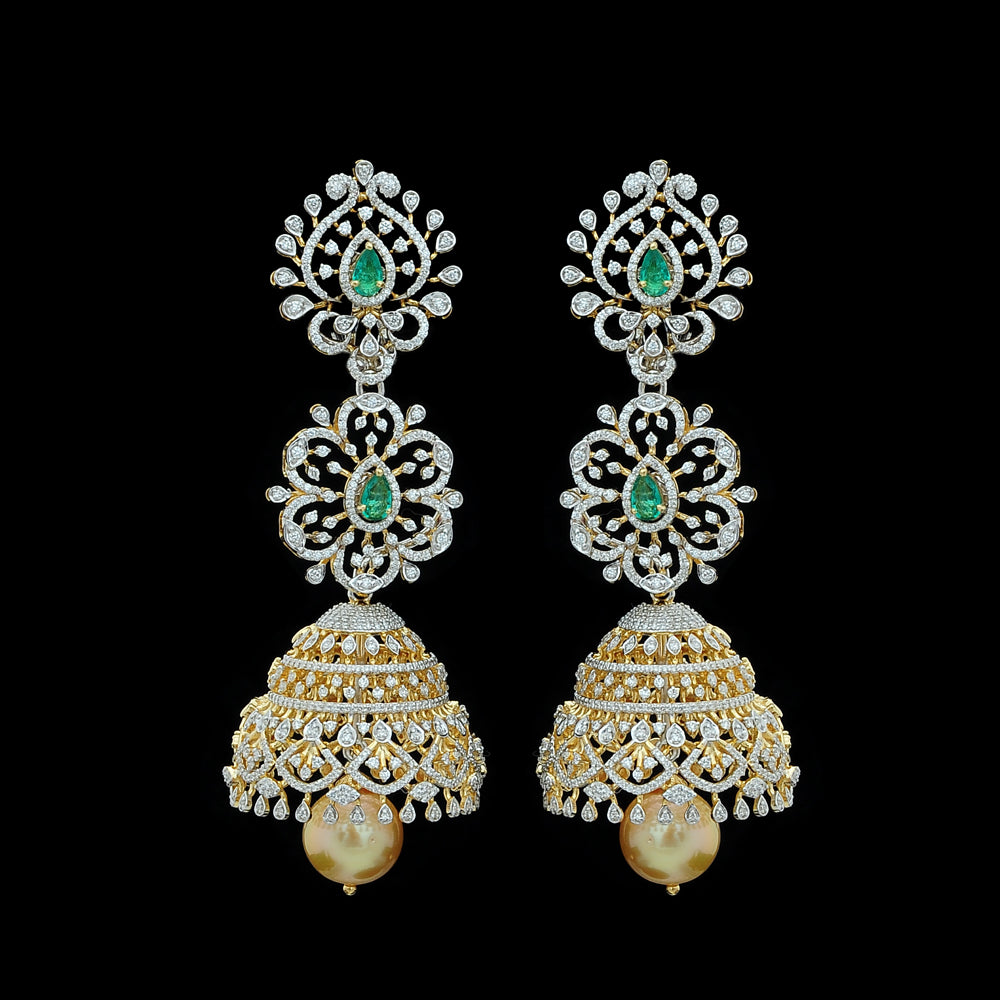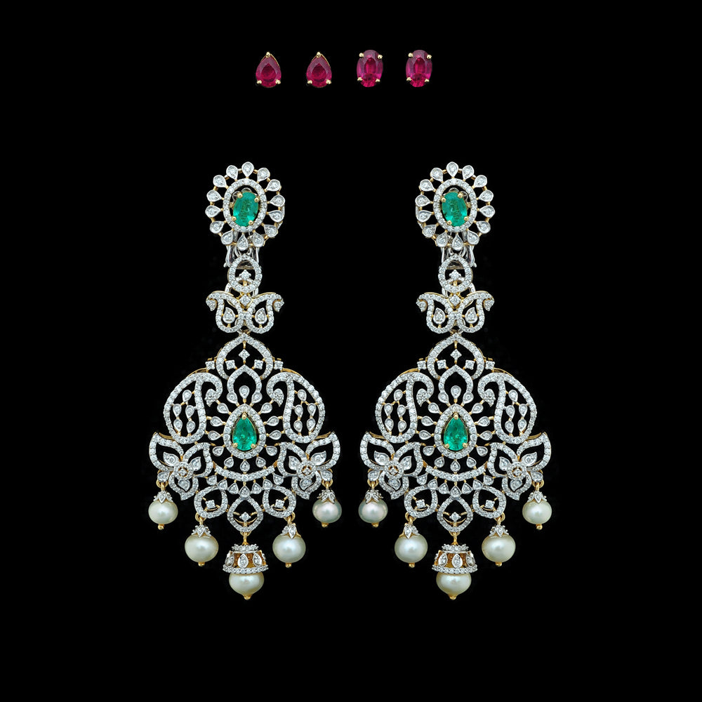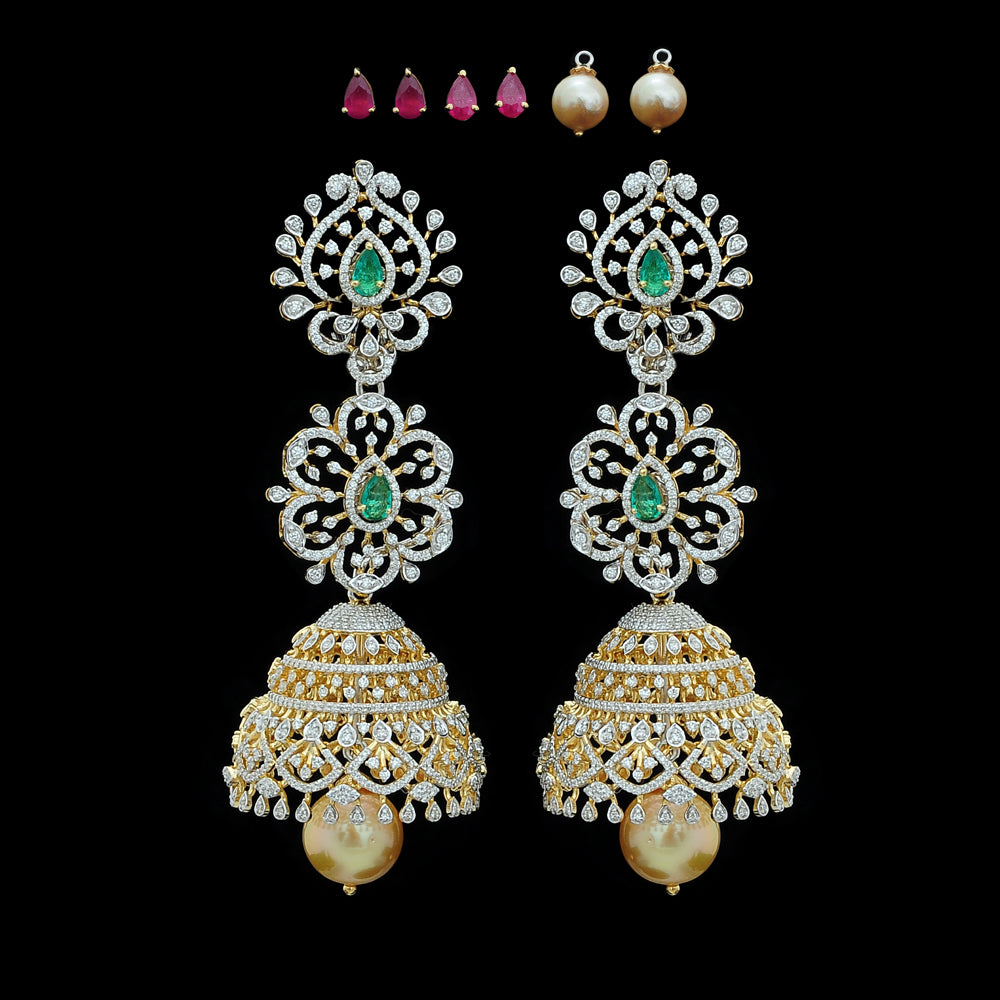 Our heartfelt congratulations to the beautifully dressed young princess as she shines on her Half Saree ceremony wearing our Diamond Choker Necklace, Long Diamond Necklace with a Pendant and Diamond Jhumkas with Natural changeable Emeralds/Rubies and Pearl Drops.