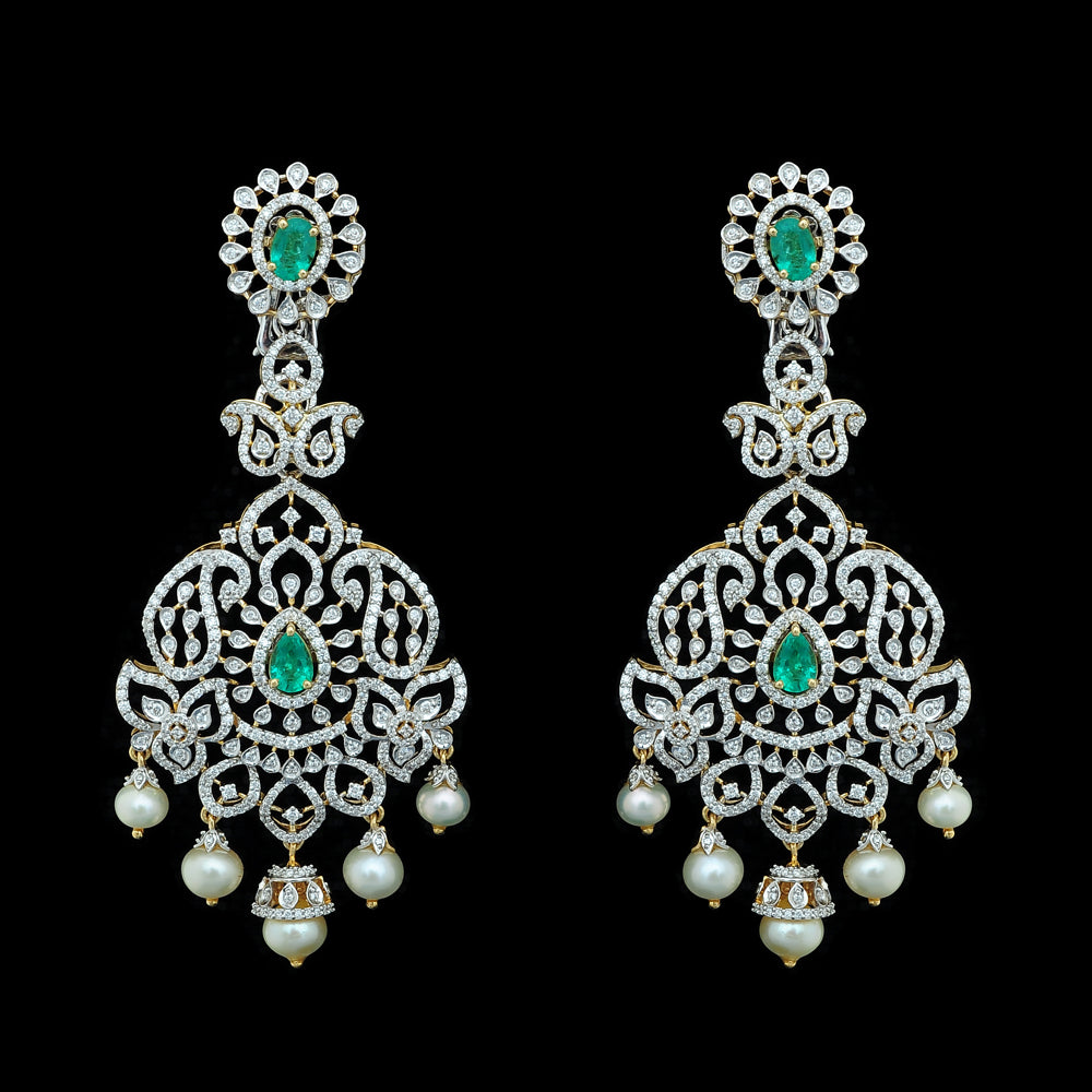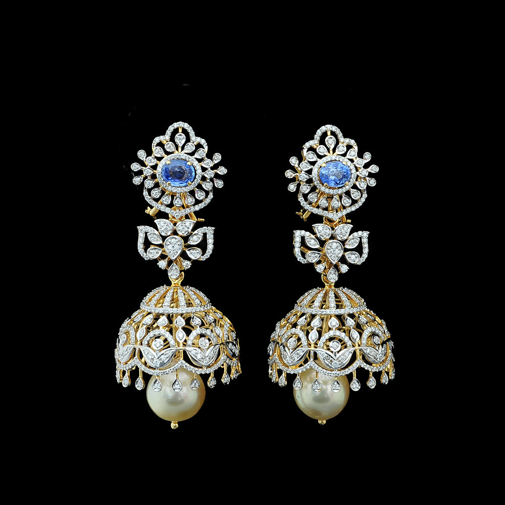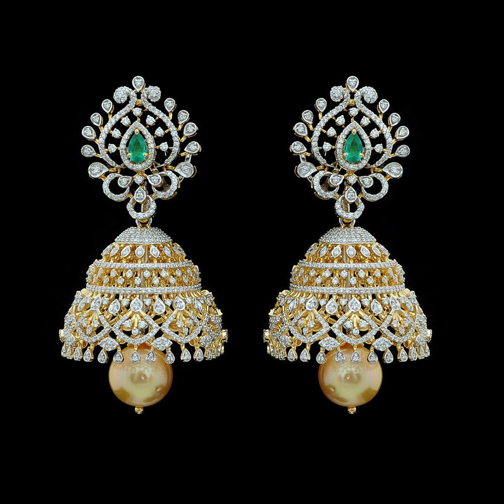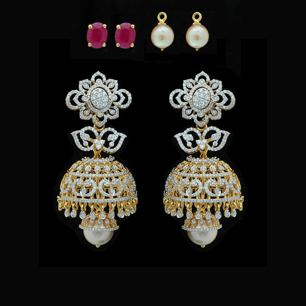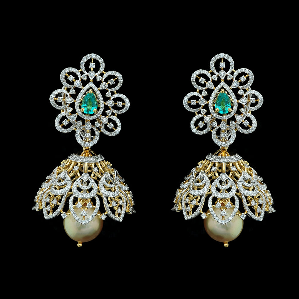 Our heartfelt congratulations to the beautifully dressed young princess as she shines on her Half Saree ceremony wearing our Diamond Choker Necklace, Long Diamond Necklace with a Pendant and Diamond Jhumkas with Natural changeable Emeralds/Rubies and Pearl Drops.